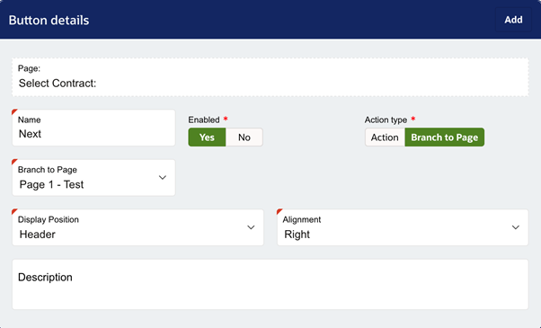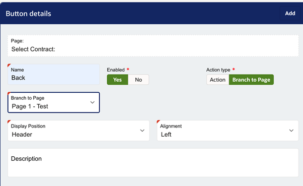 The second Button to add to the first Page is a “Next” Button. Remember to set the Action Type as “Branch to Page” to ensure that the Button will function correctly.