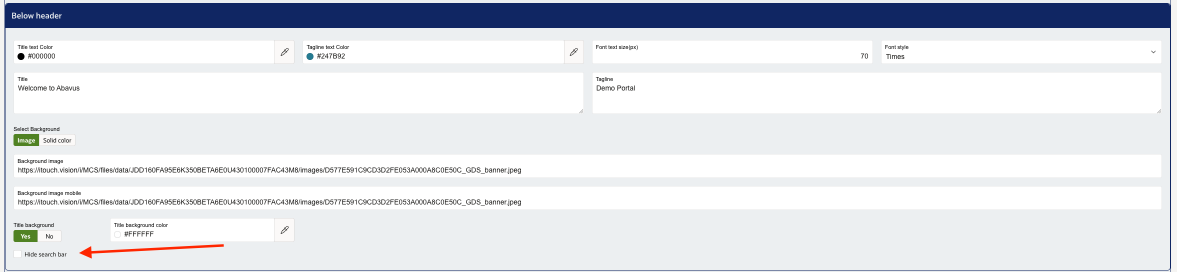 The search bar allows customers to search for a particular topic and will return any relevant form, article or page. This can be hidden by selecting the Hide search bar option as shown below.