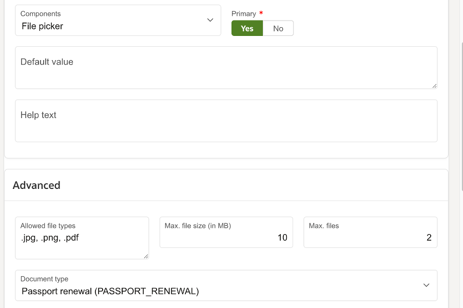 The standard File Picker component now has the option for the submitter to select a document type for their uploaded file. Admins can select one document type per File Picker, and can configure multiple File Picker components across the form (one per page) each with a defined file type associated.