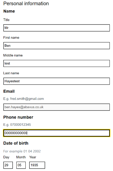 This component is split into two different functions: Me or Someone Else. This allows for situations where the submitter of the form is not necessarily the subject of the enquiry or application, such as Blue Badge forms. When the submitter encounters the component, they will be asked who the application is for: