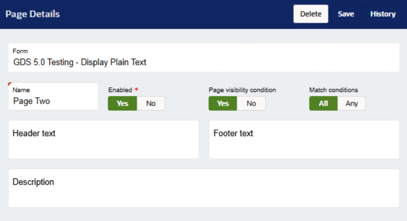 You may want to have a separate page depending on the submitter’s answer. For example, if the questions answered on a Blue Badge Application deems the submitter unqualified for a Blue Badge, the page visibility can be an effective way to redirect the submitter to a ‘You do not qualify’ page.